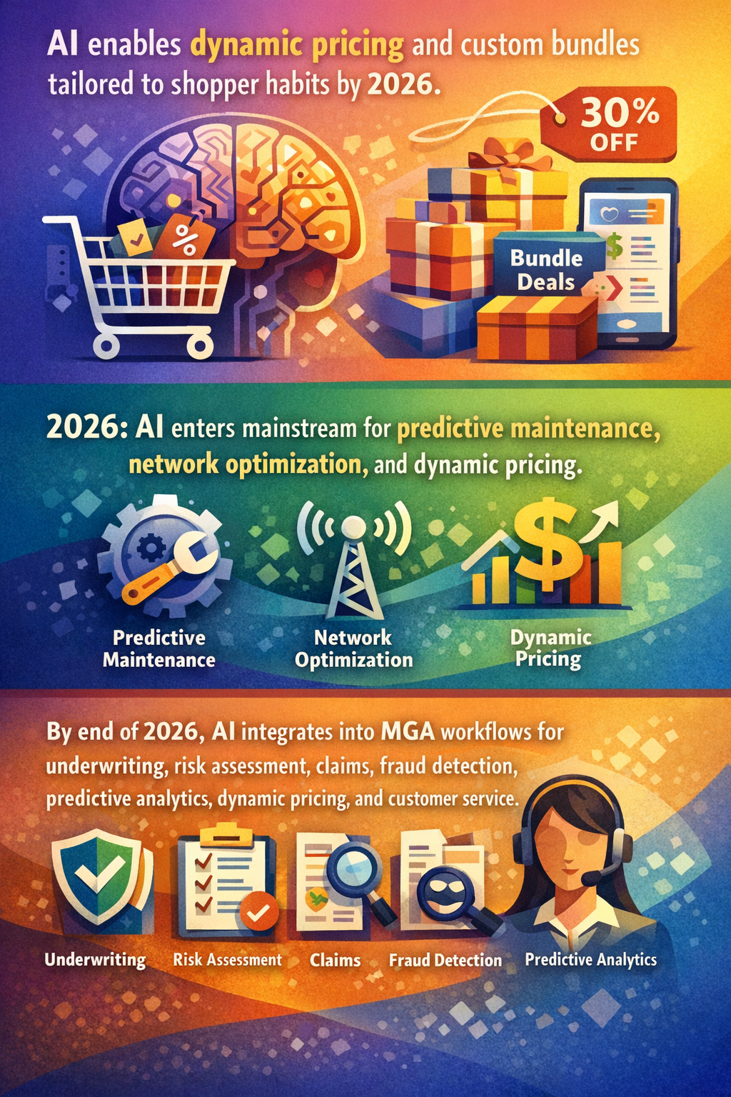 In insurance, particularly within Managing General Agents (MGAs), AI integration is scaling swiftly. Automated underwriting, risk assessment, claims processing, fraud detection, and dynamic pricing are expected to become standard by late 2026. MGAs could customize risk pricing dynamically in near real-time, responding to changing risk profiles and market conditions while enhancing customer interaction through AI-powered chatbots (Vertafore).