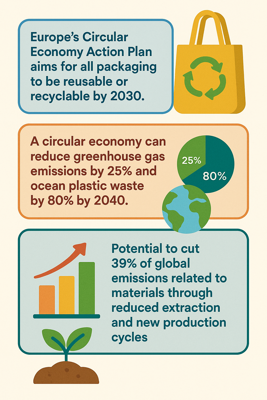 The potential improvements in global emissions by circular economy innovations are substantial. Research suggests material-related circularity could cut up to 39% of global emissions linked to materials through less extraction and energy reconfiguration (FAIST Group), while plastic waste entering oceans could decline by 80% by 2040 (Expert Market Research).