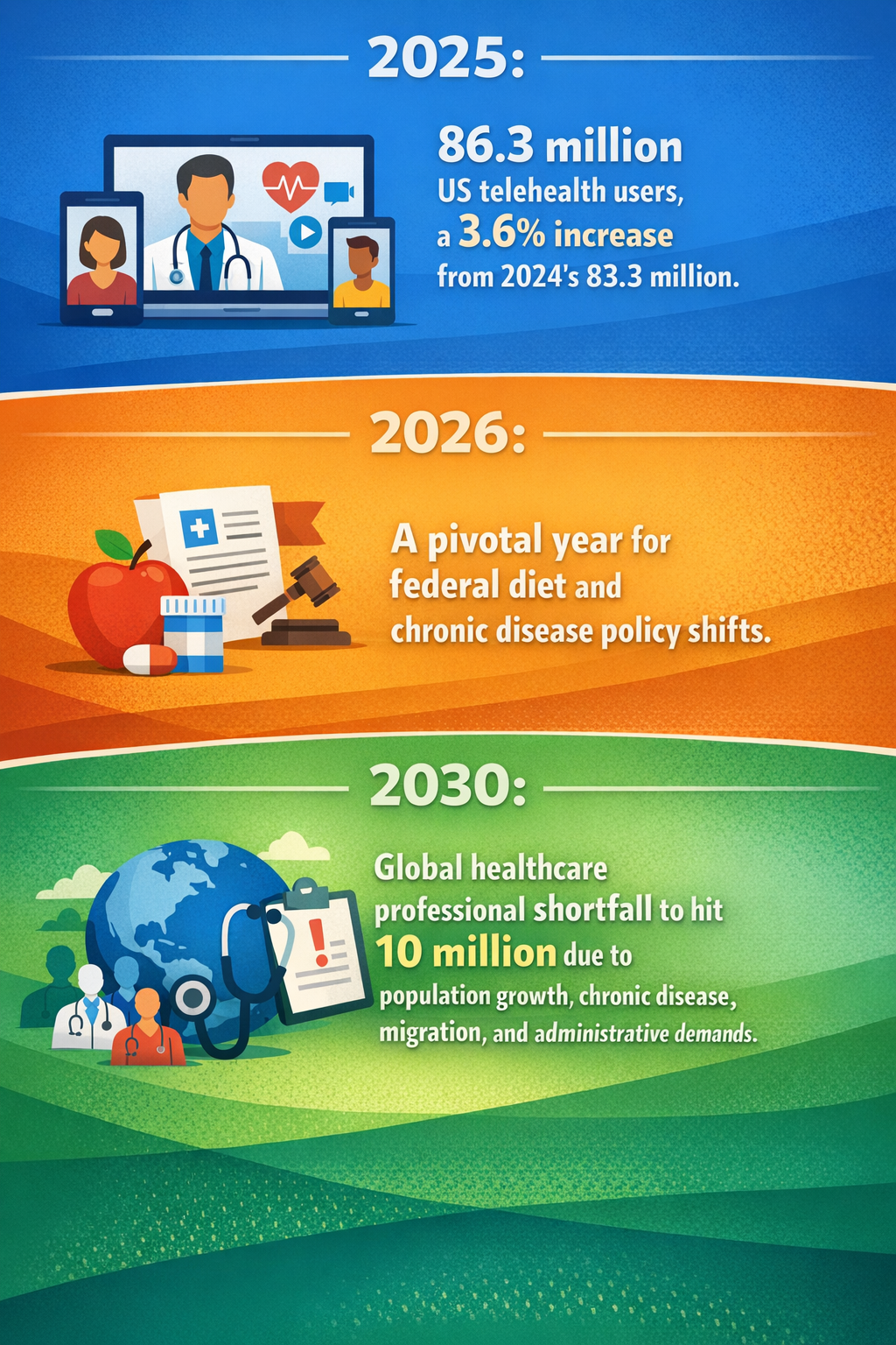 Overlaying this expansion are industry-wide headwinds: by 2030, there may be a shortfall of 10 million clinicians caused by population growth, chronic disease prevalence, international migration flows, and increases in clinical administrative burdens (RespoCare Insights). These pressures coincide with a bipartisan policy focus on preventive care, particularly federal momentum on dietary interventions for chronic diseases (UNC News), which could further shift healthcare demand profiles.