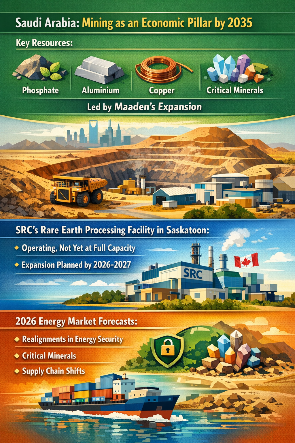 - Saudi Arabia is positioning mining as a major economic pillar by 2035, led by Maaden's expansion across phosphate, aluminium, copper and emerging critical minerals. PwC GCC Economic Themes