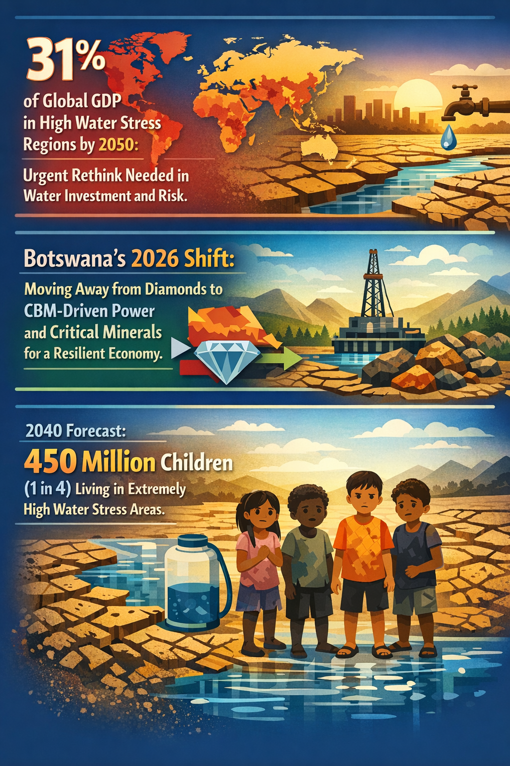 Botswana’s 2026 economic pivot away from diamond dependence towards critical minerals and coal bed methane (CBM) power exports represents a regional-level example of adapting to intertwined resource and water scarcity pressures. This structural shift may inspire other resource-dependent economies to diversify in ways closely tied to water availability and strategic commodity demands (Source).