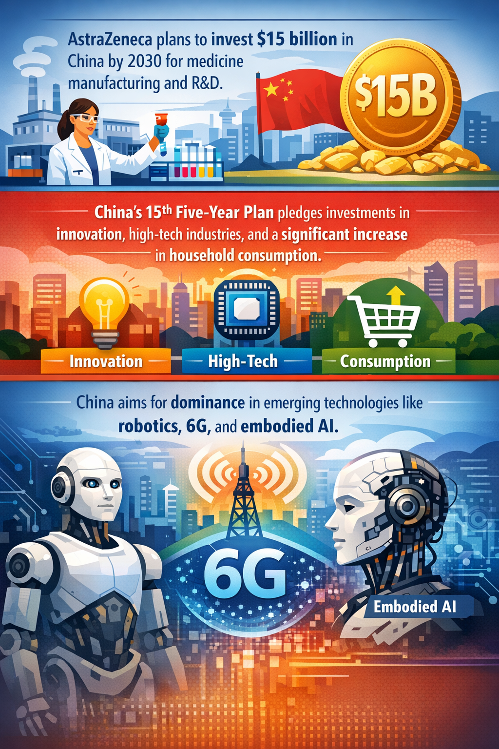 | Significant Multi-Billion Pharma Investments with Chinese Partners | Pharmaceutical giants like AstraZeneca announce vast multi-billion-dollar investments in China to expand medicine manufacturing and R&D, signaling deeper industrial engagement. | Early-adopter stage with large incumbents; directionally increasing capital flows. | Emerging | Indicates increased foreign reliance on China’s pharmaceutical capacity, potentially transforming China from follower to a leading innovation hub (Forbes). |